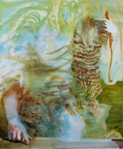 Elsewhere in the show, forms deprived of physiognomic referents take on an unsettling sensibility heightened by Hope’s color palette of terrestrial decay and mortal rot. Such is the case with Shining, Shivering, Shriveled and its depiction of a solitary outstretched arm, index finger resting atop a tabletop-like planar surface. Opposite the arm, a biomorphous form is evoked in hues of soiled ochres, the entire image set against swathes of milky blue stains and gangrenous verdigris. These are the colors of a body that isn’t neat, isn’t contained.