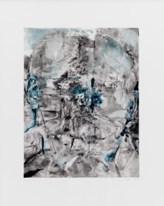 Hope’s interest in doubling extends into Mouth, moves lips as if speaking, a suite of five edition variée aquatints with monotype. Working from the same master plate—an etched image of a bald head, cleaved in two—the five prints vary in their final compositions. In one, the figure’s ears and nose are isolated in watery cobalt hues, while in another, the same face appears, half its visage shaded in the same rich blue. Soren’s interest in seriality can be understood as having less to do with discrepancy than it does with continuity—the sum of Two Time transcends its parts.