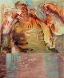 Biology is inherently messy; a fact made manifest in the materiality of Hope’s painting. “I want to give my work the opportunity to spill and puddle in the same way that bodily fluids do,” they explain, “the gesture of my hand in the work is less about indexing and more about a certain grotesqueness that can exist.” In so doing, Hope reminds us that our bodies—the totality of our being—are not hidden from us. Rather, we embrace a separation which, in truth, is not there. With Two Time, Hope reminds us that limits of perception, our awareness of the self, are not found in the world outside us—they are bound within.