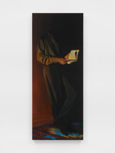 At Anat Ebgi, the show opens with The Reader (2025), a man half-swallowed by shadow, his book open to unreadable pages. The light that strikes him has no certain origin, recalling Caravaggio’s chiaroscuro, and his talent for theatrics. It could be the spill of a lamp, or the errant glow of another world. “That uncertainty lends an eeriness to the work,” Hahne Quintana says, noting he had the Italian master in mind as he painted.