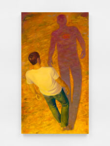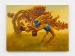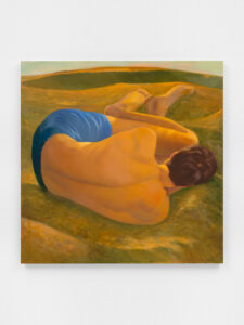 That tension heightens in Wrestlers (2025), where the figure and what looks like his duplicate lock into a suplex. The composition echoes the biblical story of Jacob wrestling an angel, a scene Hahne Quintana cites as a touchstone. “I have a nerve injury in my hip right now from wrestling, so it felt fitting,” he tells me, noting the painting’s roots in both scripture and his athletic past. Behind them, a Joshua tree bends almost into a spiral. Like much of the artist’s work, the western landscape entwines with the figures, binding their struggle to the land’s own history of endurance. Then the energy subsides. In Sleeping Giant (2025), the boy curls on his side, his sunlit back echoing the ochre slopes around him. Where Goya’s The Colossus (1808–12) imagined a giant towering above the land, Hahne Quintana’s sinks into it, indistinguishable from the land that made him.