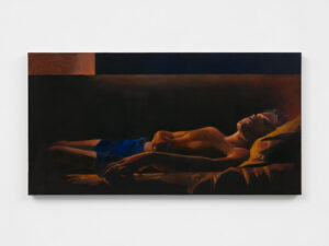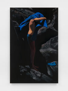 The black-ground works thrust the boy into the unknown. In Between Flesh and Stone (2025), he pulls a cobalt shirt over his head, his body half-consumed by the surrounding dark. “I almost never use that color,” the artist says. “It’s pure cobalt, which is often too much, but on black, while it pops, it also calms it down.” In Sleeper (2025), the boy lies on his back, eyes closed, his body bracketed by shadow. The pose recalls a coffin as much as a bed. Together with Sleeping Giant (2025), the two paintings form a spectrum: one in which the figure merges into the landscape, the other in which he hovers on the threshold of death.